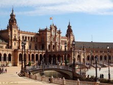 Frisch und munter starteten wir in den Tag mit einer kostenlosen Stadtführung durch sämtliche Sehenswürdigkeiten wie Kathedrale, Ayuntamiento (Rathaus), die Uni von Sevilla (in der die alte Zigarrenfabrik steht, welche Grundlage für die Oper Carmen war!!), den Torre del Oro (Goldturm) und den Plaza de España. Hier haben wir uns dann von der Tourgruppe abgekapselt und sind einfach auf dem Platz geblieben. Ich hab ja schon viele Plätze gesehen, aber dieser ist der schönste, den ich je gesehen hab!!! Hier wurden Szenen für Star Wars Episode II, Der Diktator (mit Sacha Baron Cohen) und andere Filme gedreht und er war Grundlage für Dan Browns Roman Diabolus. Ein seeehr bdeutender Platz also. Das riesige schlossartige Gebäude ist im Halbkreis angeordnet, über mehrere Brücken über einen Minifluss zu erreichen und man findet Keramikbilder von allen 48 spanischen Provinzen. Direkt an den Platz grenzt der Park „María Luisa“ an, eine riesige traumhafte Parkanlage mit Wasserfällen, Seen und Flüssen, sämtlichen Pflanzenarten und den verrücktesten Skulpturen.