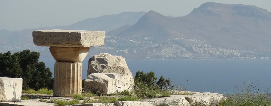 Die Anlage ist terrassenförmig aufgebaut und bietet einen tollen Ausblick über das Meer und die umliegenden Inseln. Zu sehen gibt es, wie in Griechenland üblich, viele Säulen, Altäre, Tor- und Mauerbögen und eine Menge an Treppen. Glücklicherweise bin ich dem Marco Polo Tipp gefolgt, gleich zur Eröffnung dort zu sein. Und Punkt 8 zur Eröffnung betrat ich als erster Gast des Tages die Anlage und konnte mich in Ruhe umsehen und tolle Bilder ohne im Weg rumstehende Touristen machen. Abgesehen davon waren die Temperaturen zu der Zeit noch erträglich…