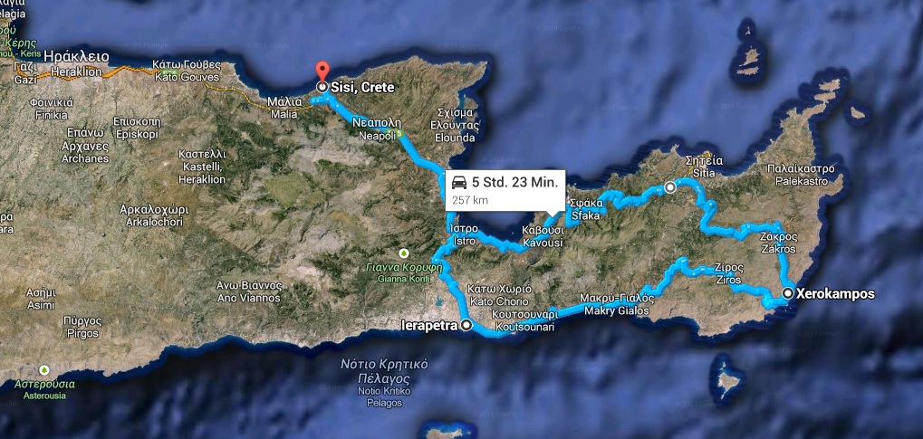 Wir fuhren Richtung Osten bis ans Südöstlichste Ende nach Xerokambos. Laut meiner Reisbibel („Marco Polo“) ist dies ein Geheimtipp für Liebhaber stiller Strände, da es dort mehrere kleine Buchten und Sandstrände gibt. Die Anfahrt allein war schon spektakulär genug. Unser Plan war es, auf der Autobahn an der Nordküste entlang bis nach Sitía zu fahren und von dort südwärts durchs Gebirge. Dummerweise führt die Autobahn aber auch schon durchs Gebirge und verlängert dadurch die Fahrtzeit ungemein. Später ging es dann noch steil bergauf und steil bergab über unglaubliche Serpentinen mit engen Haarnadelkurven. Wahnsinn, wie sich unser kleiner Fiat da durchgekämpft hat 😀
