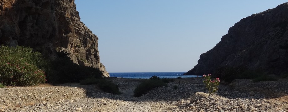Den Rest des Weges ging es zu Fuß bis ich endlich den Eingang der Schlucht erreichte. DSC07660aDer Weg durch die Schlucht dauerte nur ungefähr 30 Minuten, war aber umso schöner. Die Schlucht wurde durch zwei Rinnsale geformt, die an einer kleinen Kirche zusammen treffen und in einem kleinen, kieseligen Strand münden. Der größte Teil der Schlucht ist ein Engpass zwischen riesigen Felswänden mit unzähligen Höhlen. Und obwohl der Fluss nicht mehr bis zum Meer reicht, wachsen bis ans Ende der Schlucht Sträucher mit Blüten in allen Farben.