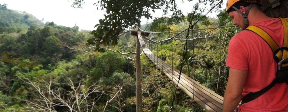 Nach der Einweisung ging es also los. Unter Zip Line muss man sich ein dickes, langes Drahtseil vorstellen, dass zwischen zwei Punkten gespannt ist (in unserem Fall immer Bäume und Plattformen). Die an der Ausrüstung befestigte Laufschiene wird auf dieses Seil gelegt und das Ganze mit einem Karabinerhaken gesichert. Dann heißt es nur noch Schwung holen und fallen lassen und mit ordentlich Speed rauscht man quer durch den Dschungel bis man an der nächsten Plattform wieder abgefangen und vom zweiten Guide in Empfang genommen wird. Eine unglaubliche Erfahrung und selbst Paddy, der anfangs eher skeptisch war was die Höhe betrifft, war am Ende super glücklich und zufrieden.