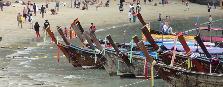 Longtails (also langes Boot, sinngemäß) sind die typischen langen Holzboote, die durch einen kleinen Propeller angetrieben werden, der an einem langen Gestänge befestigt ist. Damit können sie auch in extrem flache Gebiete fahren, wirbeln aber auch viel Sand im Uferbereich auf. Mit diesem Boot fuhren wir also an der Küste entlang, vorbei am Railay Beach zur Phra nang Bucht. Die Strände sollen zu den schönsten der Region gehören, doch durch den vorherigen Regen und die anhaltenden Wolken wurde das Bild ein wenig getrübt. Aaber was soll’s, es war immerhin schön warm. Also spazierten wir
