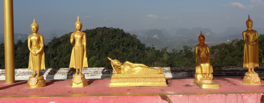 IMG-20170212-WA0038 KopieStufe für Stufe sehnten wir uns das Ende herbei und dann kamen sie endlich, die großen, magischen Ziffern „1-2-7-3“ in weiß auf blauem Eisenpfahl 🙂 Zu unserer Überraschung gab es sogar einen kostenfreien Wasserspender zum Erfrischen. Nun mussten wir noch unsere Schuhe ausziehen und im großen Schuhregal abstellen und dann kam die Belohnung für die ganze Anstrengung. Der Ausblick war tatsächlich umwerfend! Vor uns lag ein grüner Teppich aus Palmen, Dschungel und beeindruckenden Felsen, die komplett bewachsen waren. Hier und da tauchten ein paar Siedlungen auf und man konnte sogar bis nach Krabi Town und Ao Nang gucken und das Meer sehen. Einfach schön und irgendwie fast ein bisschen unwirklich.