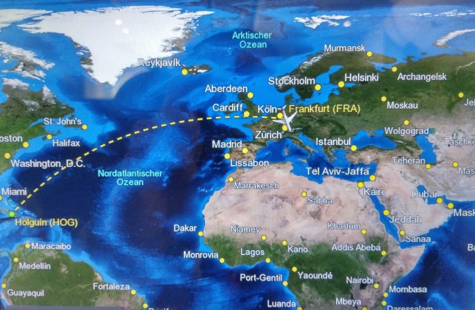 Anfang November hatte das Warten dann ein Ende!! Keine 7 Tage nach meiner „Rückkehr“ aus Kreta saß ich schon wieder im Flieger. Endlich wieder Entertainment Programm in den Sitzen vor einem und vernünftige Sitzabstände. Das Essen war erstaunlich gut, Getränke gab es ohne Ende und die Pilotin!! flog uns ohne nennenswerte Vorkommnisse bis nach Holguín, wo wir überpünktlich landeten. Mein erster Flug über den Atlantik!! Die 10 Stunden vergingen erstaunlich schnell und am Ende flogen wir sogar noch über die Bahamas. Die schwimmenden Schweine konnten wir aber leider nicht erkennen.. 😀