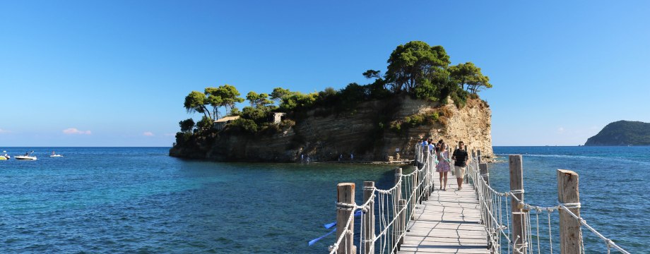 Ich entschied mich vorsichtshalber für die Weiterfahrt und steuerte mitten in das touristische Zentrum nach Laganas an der Südküste. Der Ort befindet sich ziemlich genau in der Mitte der gleichnamigen Bucht und ist in den Sommermonaten das Mekka der Partypeople. Ein bisschen wie Hersonissos oder Malia in Kreta würde ich sagen, mit dem Unterschied, dass Laganas den Marine Park direkt vor der Tür hat. Ich ließ den Ort erst mal links liegen und fuhr zum Port Sostis mit der vorgelagerten Insel Cameo. IMG_4951aDie kleine Insel ist eine der bekanntesten Attraktionen von Zakynthos und durfte auf keinen Fall auf meiner Reise fehlen. Sie gehörte einst zu Zakynthos, entfernte sich jedoch nach einem Erdbeben vom „Festland“ und ist nun über eine abenteuerliche Holzbrücke zu erreichen. Ist man einmal die steilen Stufen zum Gipfel der Insel hinaufgestiegen, muss man direkt 5€ Eintritt zahlen. Dafür gibt es dann aber einen Schlüsselanhänger mit seinem Foto von einem Fotografen vor Ort (wollte ich aber nicht) und ein Getränk an der Bar (hatte schon geschlossen). Lief also super 😀 Naja, man muss die lokale Wirtschaft ja irgendwie unterstützen.
