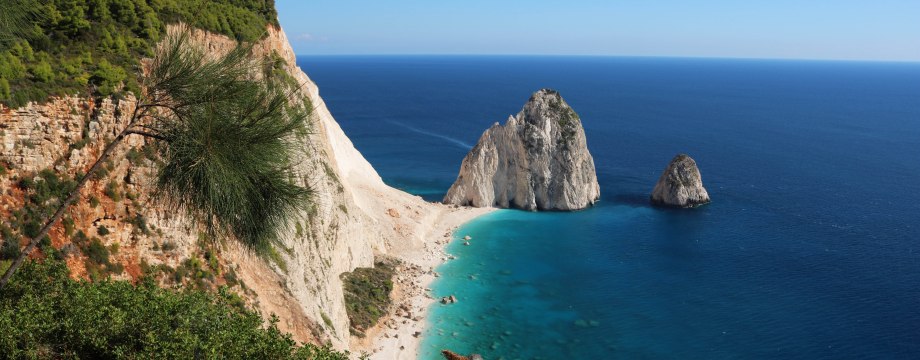 Nun wollte ich endlich zum Örtchen Keri mit seinem Leuchtturm. Entgegen meiner Erwartungen befand der sich nicht annähernd in der Nähe der Keri Caves, aber die Alterative war fast noch beeindruckender.IMG_5682a Der Leuchtturm war übrigens „nur“ der obere Teil eines gewöhnlichen Leuchtturms, also die runden Glasfenster mit umlaufendem Licht, welcher sich auf dem Dach einer Taverne befand. Ob er wirklich als Leuchtfeuer genutzt und eingetragen ist bezweifle ich mal. Die Taverne war direkt am Hang und am Rande des Abgrunds gebaut. Direkt hinter der Terrasse stürzten sich die Klippen in die Tiefe und natürlich konnte man diesen Ausblick nur gegen Bezahlung genießen. Ich habe ja im Internet viel schlechtes und auch „böses“ über die Betreiber gelesen. Aber warum sollten sie sich dieses Privileg nicht auch bezahlen lassen? Der Bau und das Grundstück werden sich ihren Preis gehabt haben und die servierten Speisen haben optisch auf jeden Fall einen guten Eindruck gemacht. Ich habe zwar nur ein Eis gegessen, aber dank Nebensaison waren nur wenige andere Gäste dort und ich konnte in Ruhe Fotos schießen. Das eigentliche Highlight waren nämlich die Mizithres Felsen. Eigentlich nur 2 Felsen im Meer, aber die Lage, der weiße Strand nebenan und der Blick aus der Vogelperspektive waren echt beeindruckend! Sollte man auf jeden Fall mal gesehen haben.