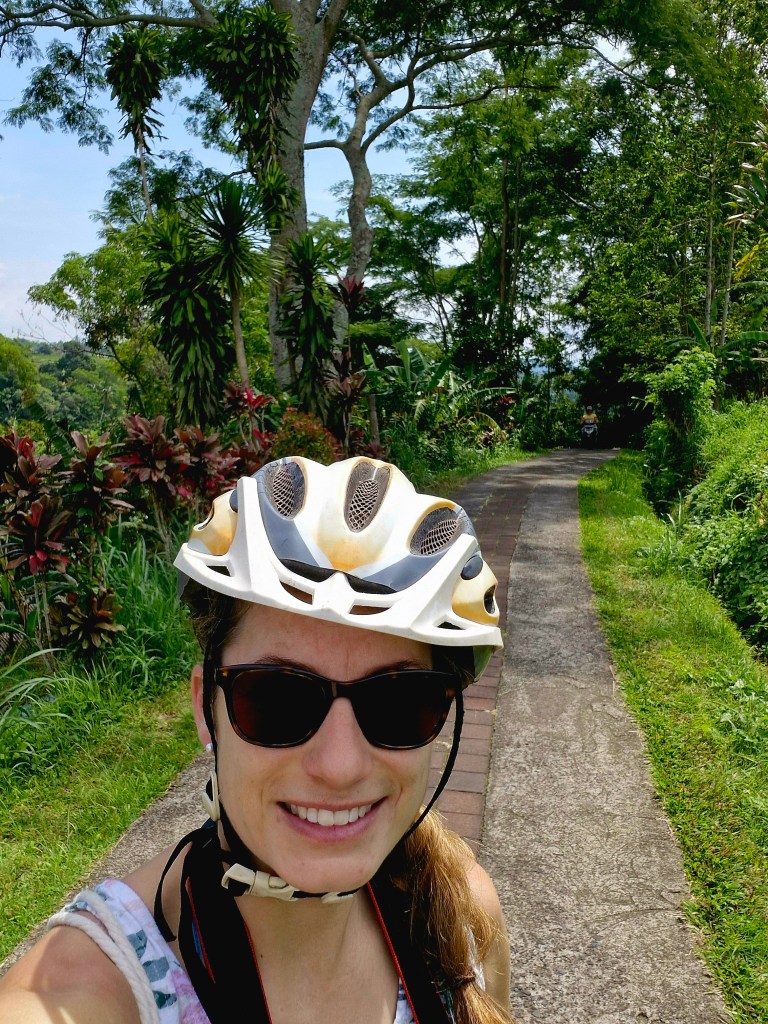 Aber ich wollte ja das Abenteuer 😀 Also einmal durchatmen, Rucksack schnappen und um Punkt 8:30 Uhr starteten wir unseren ersten Ausflugstag. Heute gab es gleich das erste Highlight – eine Radtour durch die berühmten Reisterrassen von Jatiluwih!! Auf dem Weg dahin hielten wir noch in einer riesigen Bambus-Baumhaus-Bar für Tee und Kaffee (und die Unterzeichnung unserer Todeserklärung 😀 ) und dann erhielten wir auch schon unsere Fahrräder samt Helm. Die Tour ging entspannt los, schon nach wenigen Metern gab es die ersten Fotostopps und kleinere Spaziergänge durch die Reisterrassen. Unser Bikeguide gab uns dazu immer wieder Erklärungen zum Reisanbau und dass hier noch immer alles per Hand gemacht wird. Das Wetter war recht warm und schwül und trotz ständigem Trinken meldete sich mein Kreislauf bzw. der Magen wieder. Solange wir fuhren, war dank Fahrtwind alles ok. Doch jeder noch so schöne Stop ließ meinen Zustand wieder in den Keller sinken. Doch ich hielt durch und kämpfte mich steile Berge hinauf und steinige Schotterwege hinab und genoss den Dschungel um mich herum. Es war einfach alles so unglaublich grün und tropisch bunt – einfach wunderbar.
