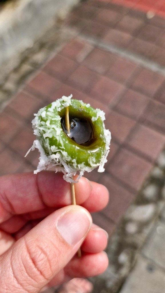 Der Weg zum und vom Tempel war von Händlern gesäumt und man musste echt hartnäckig bleiben, um am Ende nicht mit neuen Sonnenbrillen, Stoffblümchen und Holzpfeifen dazustehen. Am Eingang des Tempels kaufte Guide Parek für uns Mochi Bällchen zum probieren. Grüne Japanische Bällchen aus Reisteig mit einer süßen Füllung und Kokosraspeln drum herum. Sowas habe ich echt noch nie gegessen, schmeckte aber ganz gut und Mochi soll sogar gut für das Immunsystem, den Muskelaufbau und die Zufuhr von Nährstoffen sein. Sieh an…