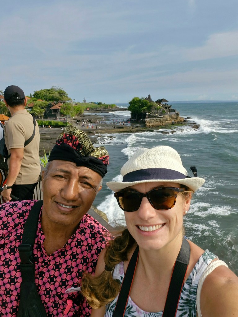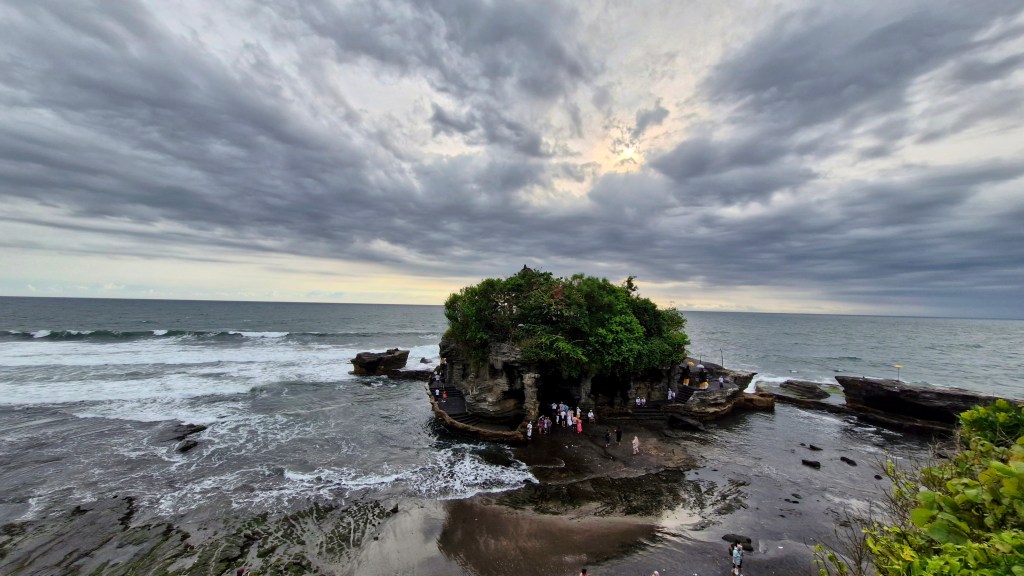 Zurück zur Tour! Nachdem wir den Tempel besichtigt und literweise Schweiß verloren haben 😀 ging es mit unserem Privatbus ans Meer an die Südküste zum Wassertempel „Pura Tanah Lot“ , übersetzt „Land inmitten des Meeres“. Der Tempel befindet sich auf einem Felsen und kann je nach Wasserstand zu Fuß erreicht werden. In einer Höhle unter dem Felsen gibt es Wasserschlangen, die als heilig gelten und den Tempel bewachen sollen.