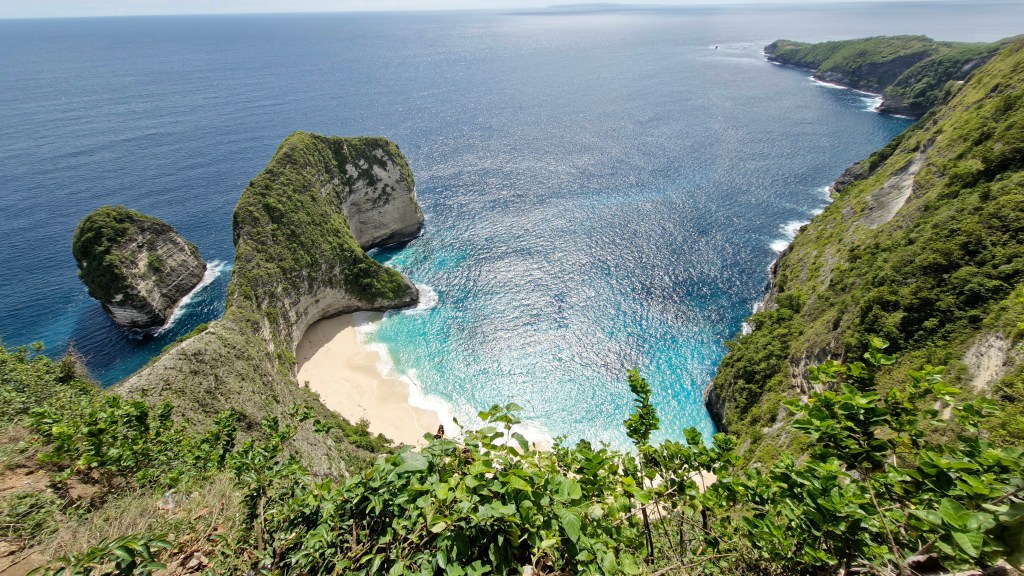Nun ging es fast eine ganze Stunde lang quer über die Insel zur Südseite zum Kelingking Beach. Zum Strand selbst gelangte man allerdings nur, wenn man den schmalen Pfad an den grün bewachsenen Klippen entlang nach unten gelaufen wäre. Da uns hier nur wenig Zeit gegeben wurde und relativ viele Leute hier unterwegs waren, entschied ich mich gegen den Abstieg und genoss stattdessen den wahnsinnig schönen Ausblick für den sich die Fahrt definitiv gelohnt hat!