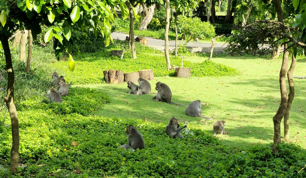 Der Schreck musste erst einmal verdaut werden.. Zum Glück folgte nun das Highlight des Ausflugs, der Kecak-Tanz, der im Amphietheater südlich vom Tempel vorgeführt wurde. Die Sitzplätze waren bis auf den letzten Platz gefüllt und ich setzte mich nach fast ganz oben. Eine gute Entscheidung, denn auch hier kamen die Affen hochgeklettert und mopsten den Gästen der obersten Reihe gerne Handys und Sonnenbrillen. Die Mitarbeiter dort konnten sie aber zum Glück wieder zurückholen.